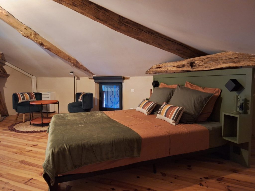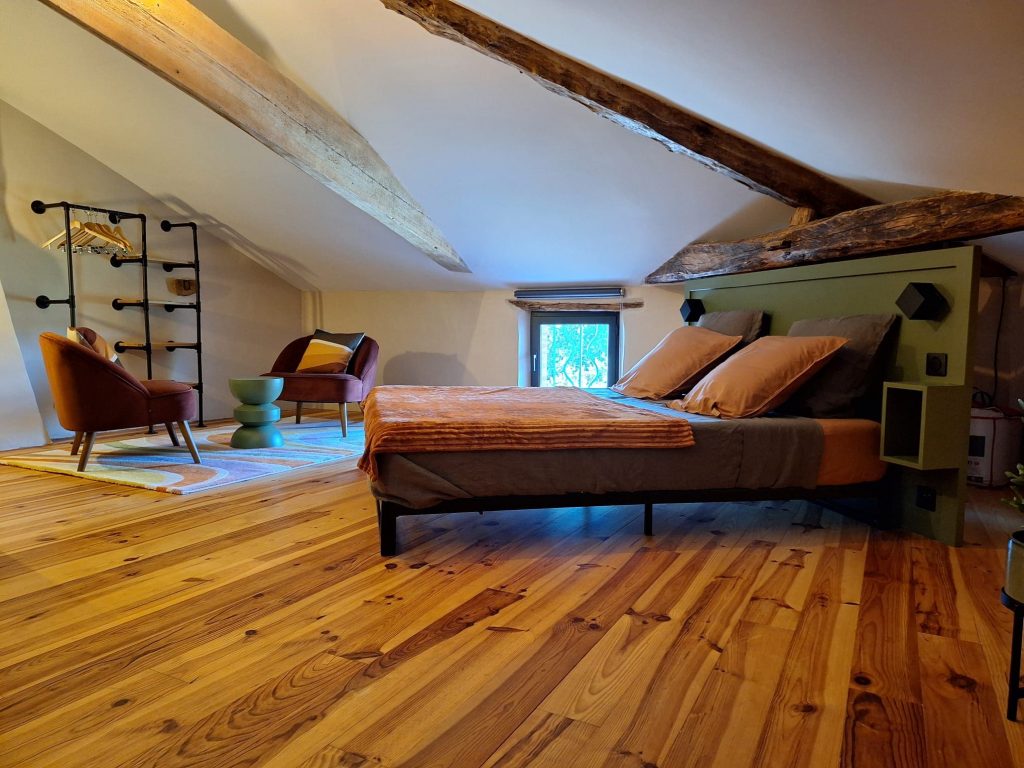 Après un grand couloir où la tommette rappelle l’origine de la construction du Pigeonnier de Pauly, accédez à la chambre Picasso avec 1 lit 160, rangements, une salle d’eau privative avec douche lavabo et toilettes sèches. Au 1er étage deux autres chambres : la chambre Derain avec 1 lit 160, une salle d’eau privative avec douche, lavabo, toilettes sèches et la chambre Véronèse avec 1 lit 160, une salle d’eau privative avec douche, lavabo, toilettes sèche. Toutes les chambres sont climatisées